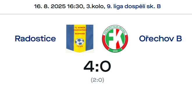 V sobotu jsme doma odehráli utkání proti Ořechovu B. Soupeř dorazil v oslabené sestavě. Áčko hrálo v Slatině a tak museli povolat do boje i pár dorostenců. Agilnímu soupeři chyběla kvalita. Po zemi se k naši brance moc soupeř nedostal a nákopy naše obrana posbírala nebo byli i na rychlíky z Ořechova až příliš dlouhé. My jsme se ujali vedení naši novou posilou Dominikem který si ve vápně šikovně zpracoval balon a pohotovou střelou k tyči otevřel jeho střelecký účet 1:0. Po chvilce měl opět Dominik samostatný nájezd, který ovšem hostující gólman zneškodnil. Do třetice se již Dominik nemýlil, kdy nabíhající nahrávku od Jožky doběhl a zvýšil skóre na 2:0.